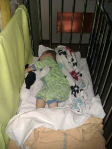 Jag mådde helt enkelt rätt risigt så jag fick inhalera medicin varannan timme, det blev ganska många gånger med tanke på att vi kom in vid lunchtid :-/ Vi bestämde att morsan skulle stanna kvar med mig (tyvärr fick inte båda stanna) och jag blev tilldelad en väldigt ”mysig och ombonad” spjälis. Hade svårt att komma till ro där på kvällen eftersom jag var övertrött (hade inte sovit på hela dan nästan) och så blir man speedad av medicinen, och dessutom hjälpte den ju inte + att jag hade feber. Rätt mycket prutt med andra ord. Men tillslut så somnade jag efter en skvätt välling.