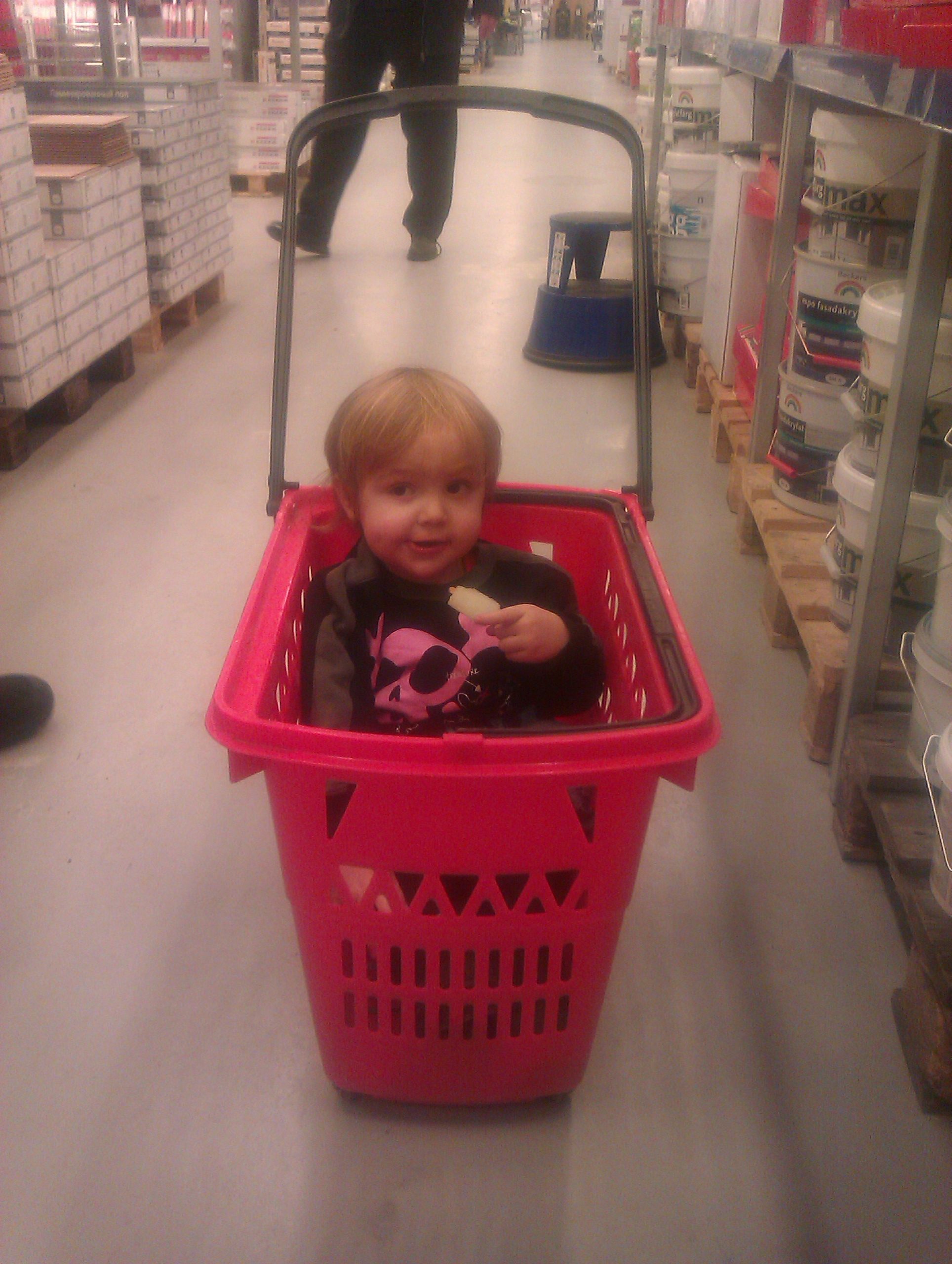 Igår var vi på nån skitatråkig affär och köpte massa tapeter, färg å penslar å sånt. Som tur var kom mormor och morfar dit och lekte med (läs jagade) mig. Tillslut stoppade dom ner mig i en korg och mutade mig med glass, jag var den sista å klaga 🙂