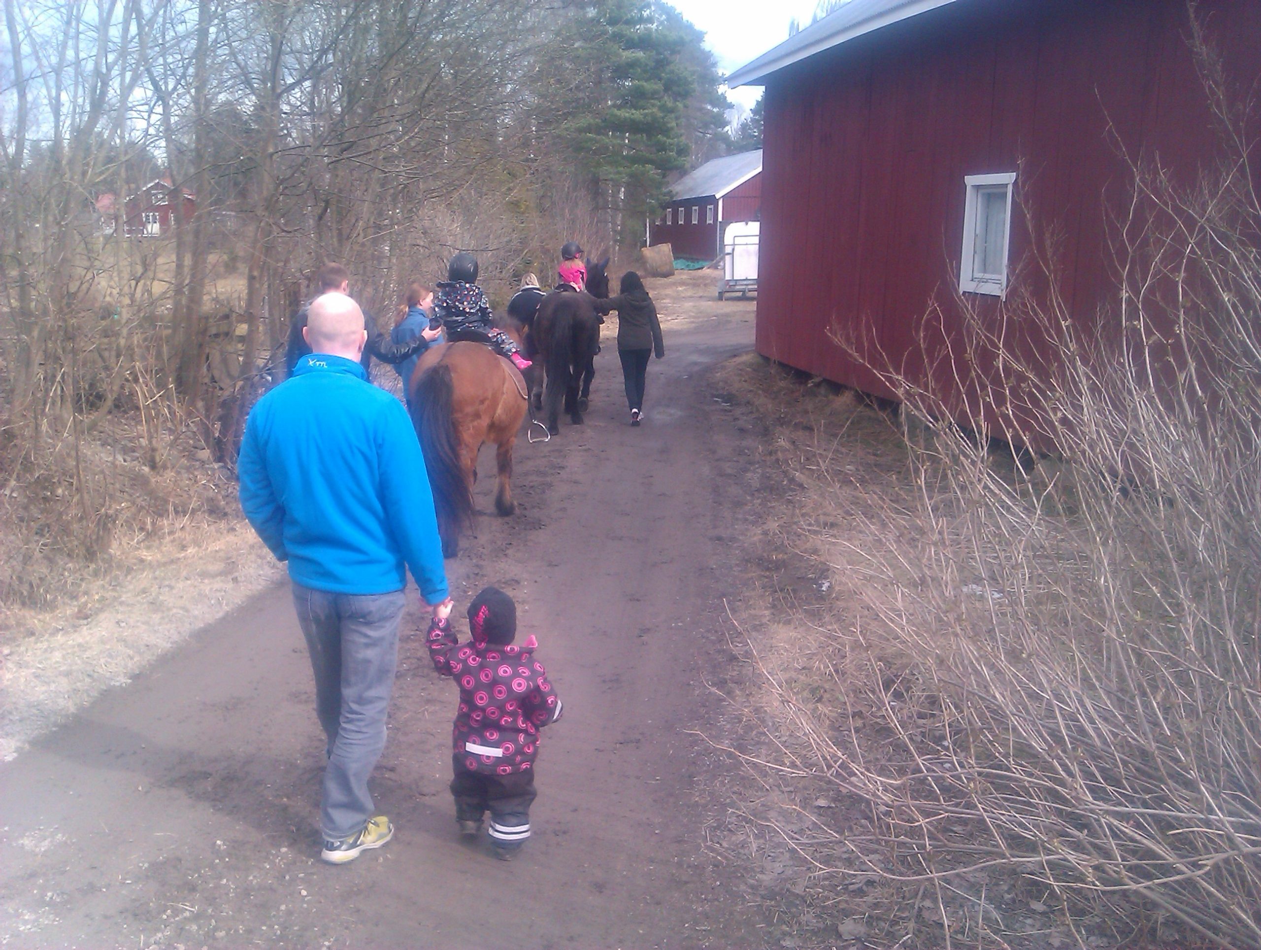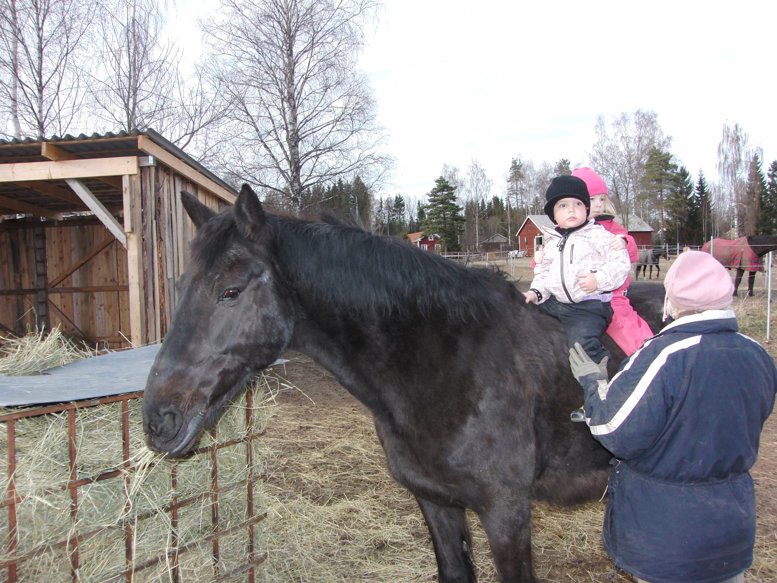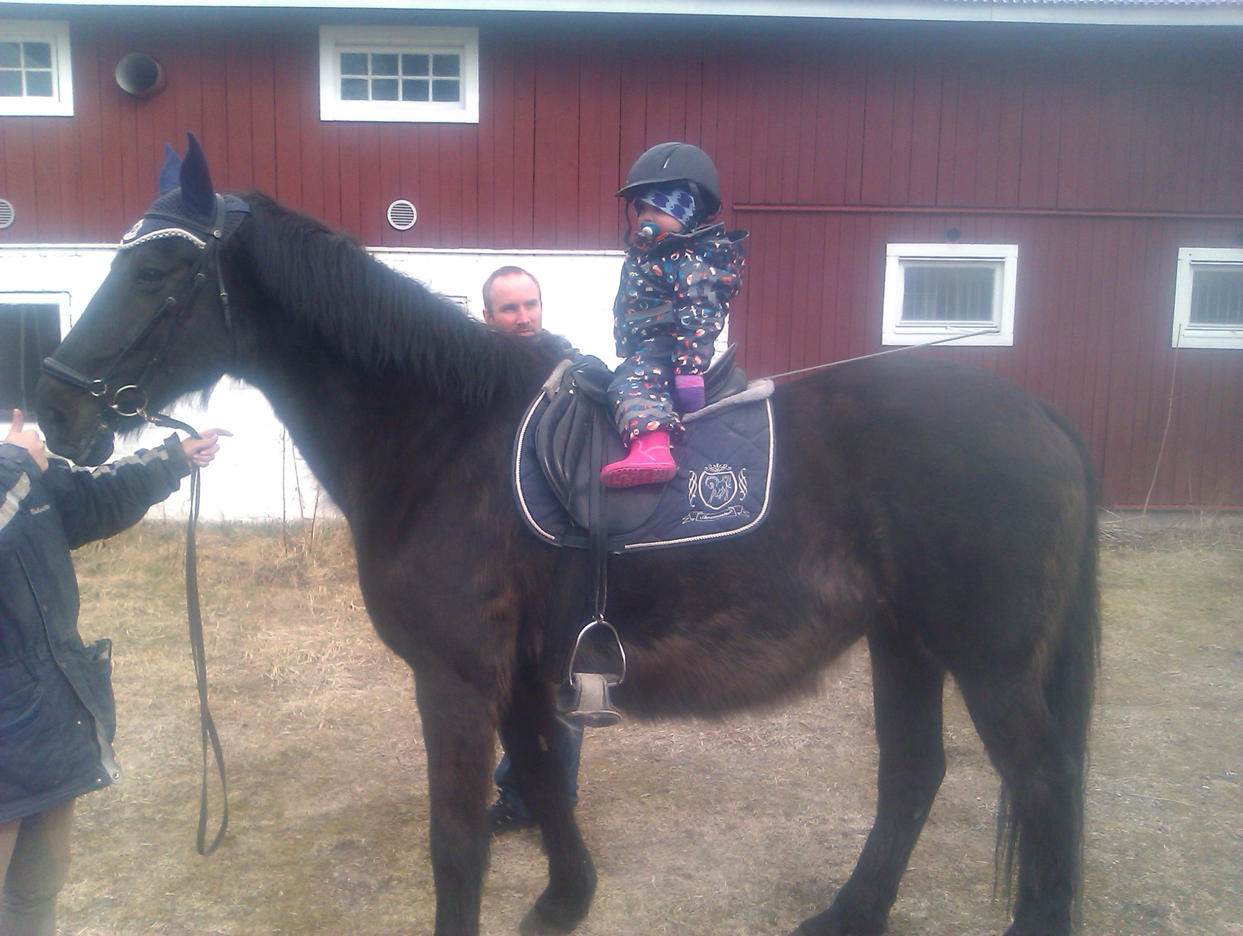 I måndags var vi till badhuset med Bellan och Linda! Jag hoppade som en tok till morsan och satt som en smäck på ryggen på farsan, Bellan satt som ett frimärke runt Lindas hals 😉 Efter ett tag hade vi tröttat ut dom vuxna med massa åk i vattenrutchkanan så då åt vi lite glass och pommes (i den ordningen) och sen åkte vi hem till Gabriel och Jonas för lite pannkaksätande. Efter det gick vi ut och lekte och rätt var det var sprang vi på 2 hästtjejer som frågade om vi ville rida på deras hästar (bor man på en hästgård är det visst sånt man får räkna med!). Det ville inte jag men efter lite övertalning (tvång?) från morsan hoppade jag på (läs: spjärnade emot) och sen ville jag inte kliva av – både jag och Bellan fick rida på båda hästarna och sen fick vi följa med och hämta mat åt dom också 🙂